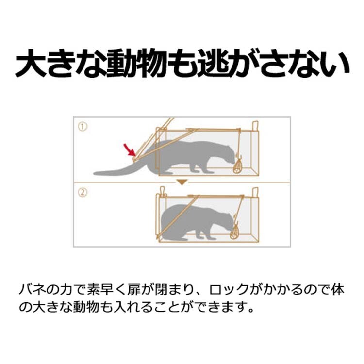 ●バネの力で素早く扉が閉まり、ロックがかかるので体の大きな動物も入れることができます。