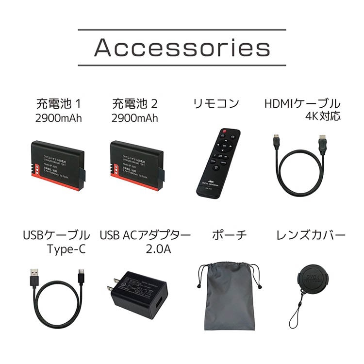 | ・付属品:充電池 BP-29M(2)、リモコン RM-9V7(1)、HDMIケーブル(1)、ポーチ(1)、USB ACアダプター(1)、USBケーブル(1)、レンズカバー(1)、リモコン用乾電池(2)、取扱説明書(1)、保証書(1) |