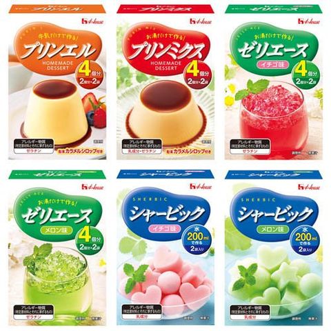 | 4902402914267 54g プリンエル 4902402914274 74g プリンミクス 4902402914281 92g ゼリエース イチゴ味 4902402914298 92g ゼリエース メロン味 4902402914304 86g シャービック イチゴ味 4902402914311 86g シャービック メロン味 各1 |