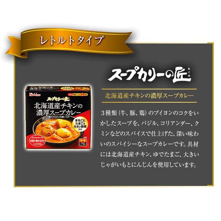| 4902402921098 160g カレーでニクる。 牛肉 4902402921104 160g カレーでニクる。 豚肉 4902402865828 スープカリーの匠 北海道産チキンの濃厚スープカレー 各1 |