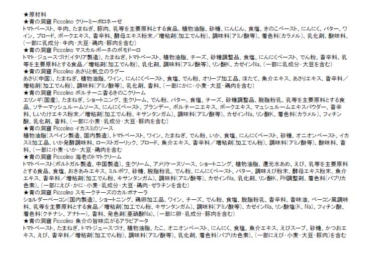 | ★青の洞窟 Piccolino クリーミーボロネーゼ:乳成分・牛肉・大豆・鶏肉・豚肉 ★青の洞窟 Piccolino マスカルポーネのポモドーロ:乳成分・大豆 ★青の洞窟 Piccolino あさりと帆立のラグー:かに・小麦・大豆・鶏肉 ★青の洞窟 Piccolino ポルチーニ香るきのこクリーム:小麦・乳成分・大豆・豚肉 ★青の洞窟 Piccolino イカスミのソース:小麦・いか・大豆・鶏肉 ★青の洞窟 Piccolino 海老のトマトクリーム:えび・かに・小麦・乳成分・大豆・鶏肉・ゼラチン ★青の洞窟 Piccolino スモークチーズのカルボナーラ:卵・乳成分・豚肉 ★青の洞窟 Piccolino 魚介の旨味広がるアラビアータ:えび・小麦・大豆・豚肉 |