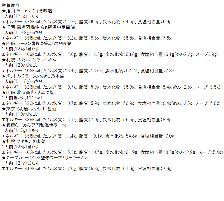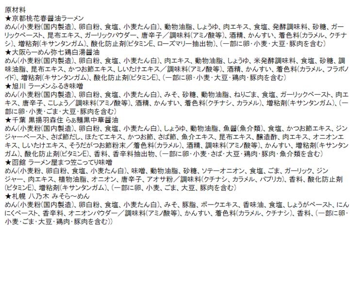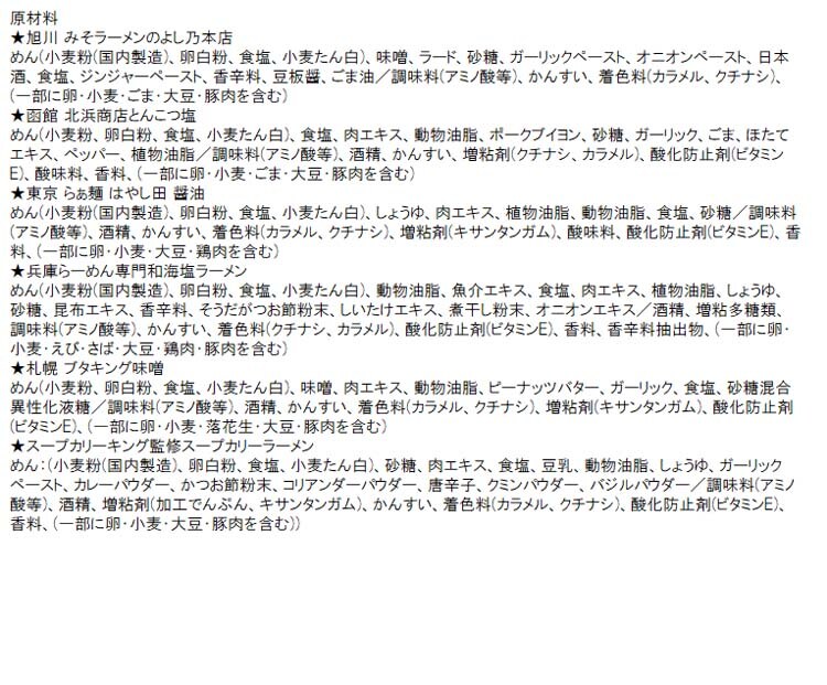 | ★いそのかづお札幌ブラック:卵・小麦・ごま・大豆・鶏肉・豚肉 ★札幌 三代目月見軒醤油:卵・乳成分・小麦・牛肉・大豆・鶏肉・豚肉・ゼラチン ★札幌 三代目月見軒味噌:卵・小麦・牛肉・ごま・大豆・豚肉・りんご・ゼラチン ★旭川 らぅめん青葉醤油:卵・乳成分・小麦・大豆・鶏肉・豚肉 ★らーめんや天金 旭川しょうゆ味:卵・小麦・大豆・鶏肉・豚肉 ★横浜ラーメン六角家 豚骨醤油:卵・小麦・大豆・鶏肉・豚肉 ★山頭火本店のまかないラーメンあわせ:卵・小麦・ごま・さば・大豆・豚肉 ★埼玉狼煙濃厚醤油らーめん:卵・小麦・ごま・さば・大豆・鶏肉・豚肉 ★京都桃花春醤油ラーメン:卵、小麦、大豆、豚肉 ★大阪らーめん弥七鶏白湯醤油:卵、小麦、大豆、鶏肉、豚肉 ★旭川 ラーメンふるき味噌:卵・小麦・ごま・大豆・豚肉 ★千葉 黒揚羽森住 らぁ麺黒中華醤油:卵・小麦・さば・大豆・鶏肉・豚肉・魚介類 ★函館 ラーメン屋まつ笠こってり味噌:卵、小麦、ごま、大豆、豚肉 ★札幌 八乃木 みそら~めん:卵・小麦・ごま・大豆・鶏肉・豚肉 ★旭川 みそラーメンのよし乃本店:卵・小麦・ごま・大豆・豚肉 ★函館 北浜商店とんこつ塩:卵・小麦・ごま・大豆・豚肉 ★東京 らぁ麺 はやし田 醤油:卵・小麦・大豆・鶏肉 ★兵庫らーめん専門和海塩ラーメン:卵、小麦、えび、さば、大豆、鶏肉、豚肉 ★札幌 ブタキング味噌:卵・小麦・落花生・大豆・豚肉 ★スープカリーキング監修スープカリーラーメン:卵・小麦・大豆・豚肉 |