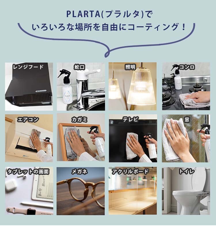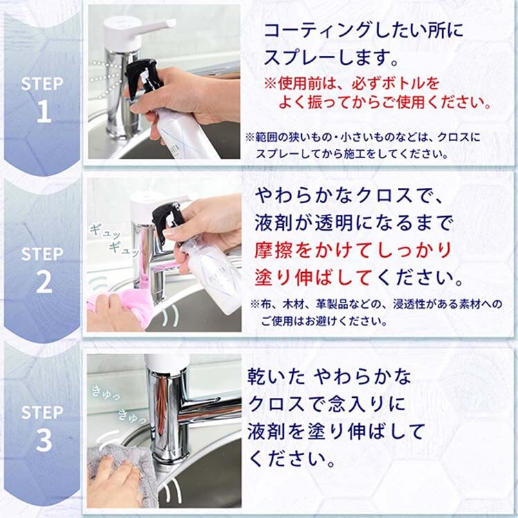 ・コーティングする場所の汚れ、ゴミ、埃等を除去し、スプレー後スポンジ、クロス等で薄く塗り延ばし、すぐに乾いたクロス等で拭き上げてください。