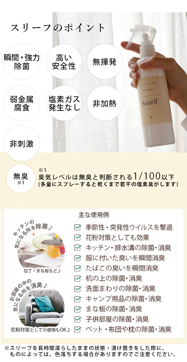 ●Sourif(スリーフ)は、「次亜塩素酸水」ではありません。また、「酸性」の次亜塩素酸ナトリウムでもありません。