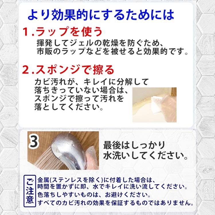 ●カビが取れるジェルは、増粘剤ゼロ。ジェルは拭き取り要らず、キレイに洗い流すだけ。次亜塩素酸を中心とした特殊な増粘剤ゼロのジェル成分に、カビ除去に特化した特殊成分を配合したオリジナルの高濃度カビ取りジェル剤です。