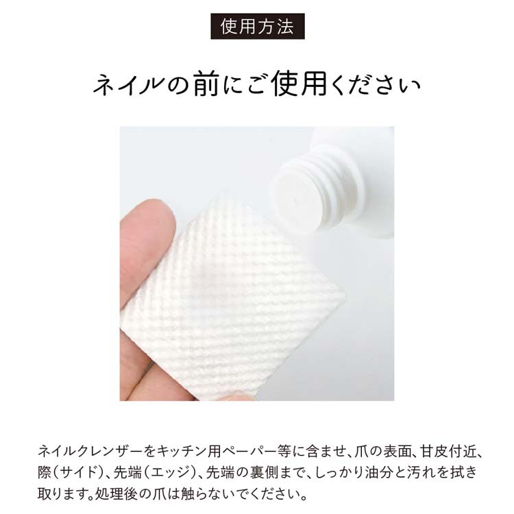 ・よく爪を洗い乾燥させます。キッチン用ペーパー等に適量を含ませ爪表面、甘皮付近、際(サイド)、先端(エッジ)、先端の裏側までしっかりと油分と汚れを拭き取ります。処理後の爪には触らないでください。その後お手持ちのネイルを塗ってください。