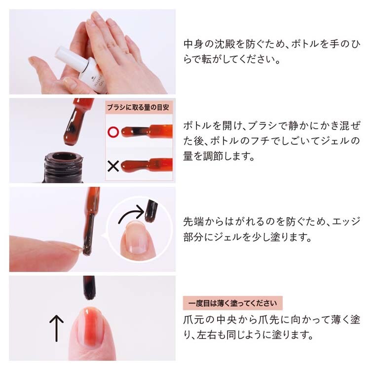 ・既にジェルネイル(他社様商品やサロン施術)を塗っている上から塗らないでください。すでに塗っているジェルネイル等の相性によりジェルが完全に硬化しなかったり、逆に密着しすぎ、はがす時に下に塗っているジェルの表面もはがしてしまう可能性がございます。
