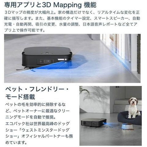 | ★仕様 ・サイズ(mm) セット:幅約394×奥行約443×高さ約527.5 本体:幅約320×奥行約353×高さ約95 ・清掃音:64.9dB(sweep)/65.5dB(sweep&mop) ・電源方式:6400mAh ・最大稼働時間:最大161分 ・充電時間:5.5h ★基本情報 ・カーペット検出(自動認識) ・吸引力の変更:8000pa ・ダストボックス容量:420ml ・自動ゴミ収集機 ・YIKO音声アシスタント ・ビデオマネージャー ・自動給水・モップ洗浄・乾燥 ・マッピング機能 ★水拭き機能 ・水タンクタイプ:清水4L/汚水3.5L ・水量の調節 ・水タンク容量:180ml ★インタラクション ・マップ作成(by ECOVACS HOME アプリ) ・音声レポート(Voice Report) |