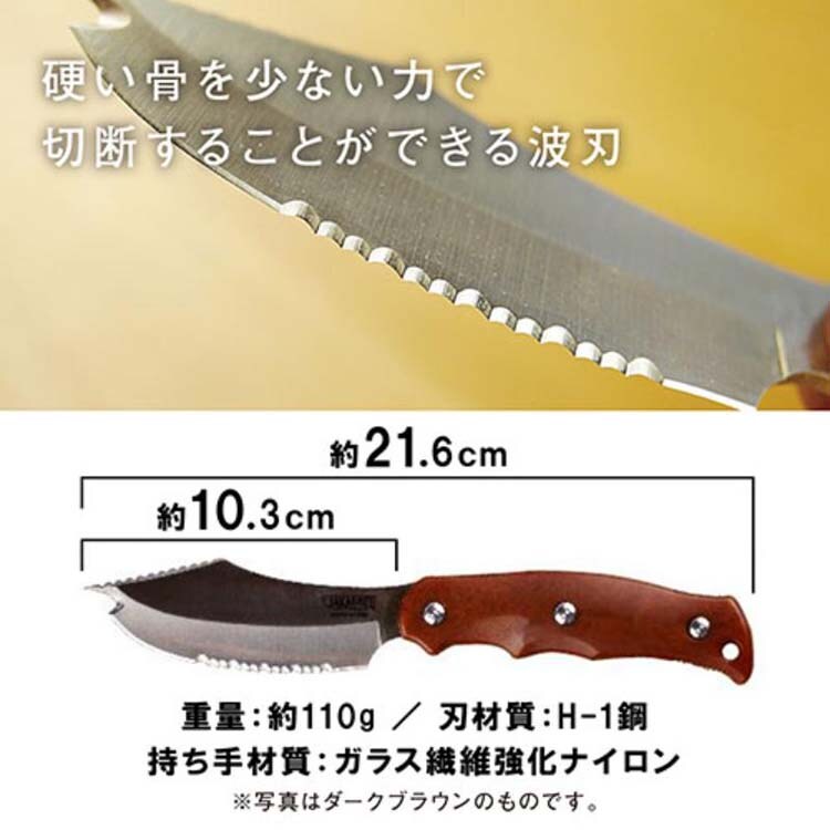 ●のこぎりのような形状の波刃で、硬い骨を少ない力で魚の頭を切断することができます。