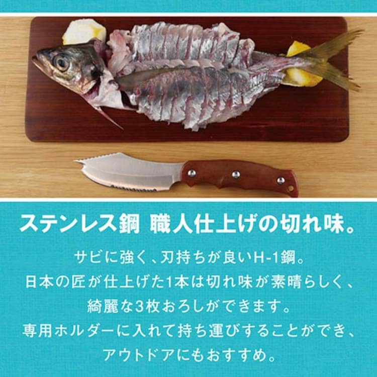 ●サビに強く、刃持ちが良いH-1鋼。日本の匠が仕上げた1本は切れ味が素晴らしく、綺麗な3枚おろしができます。