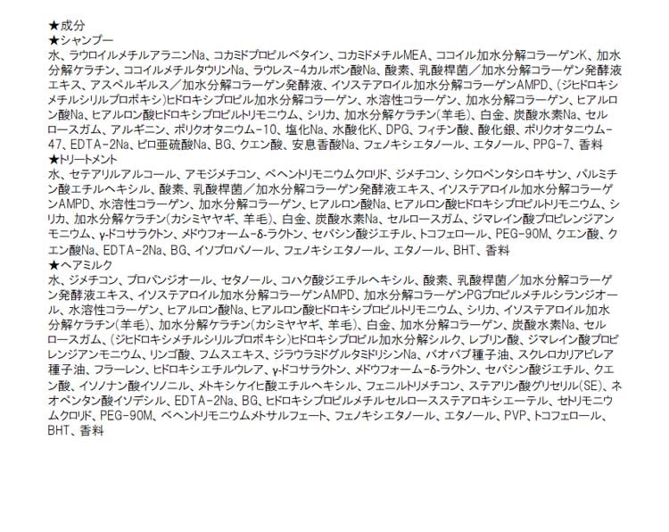 ※1 シャンプー・トリートメント・ヘアミルク:乳酸桿菌、加水分解コラーゲン発酵液エキス(保湿成分)、ヘアオイル:イソステアロイル加水分解コラーゲンAMPD(保湿成分)