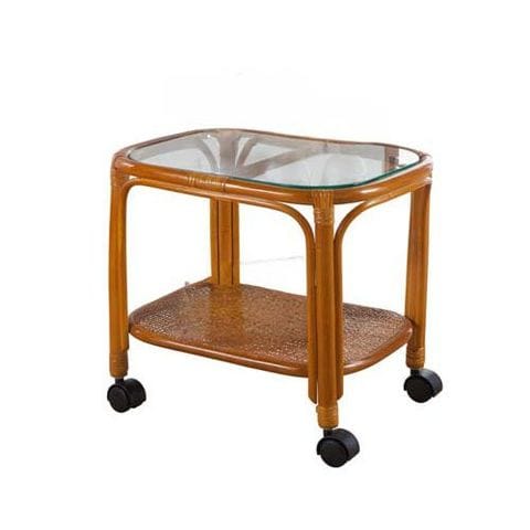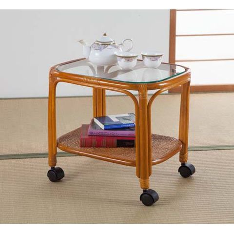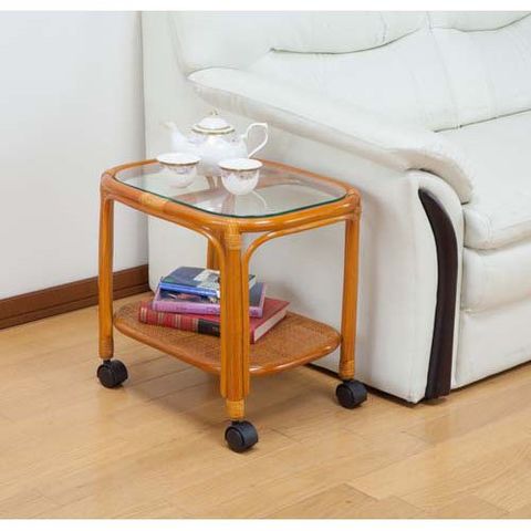 | ・サイズ:(約)幅45×奥行35×高さ41cm ・重さ:(約)3kg ・耐荷重量:(約)10kg ・素材/フレーム:籐・ウレタン樹脂塗装、天板:5mm厚強化ガラス ・キャスター付き |