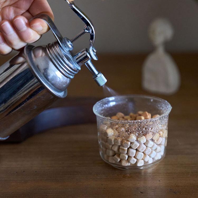 ・器に入れたヒノキチップに霧吹きすると加湿効果があります。