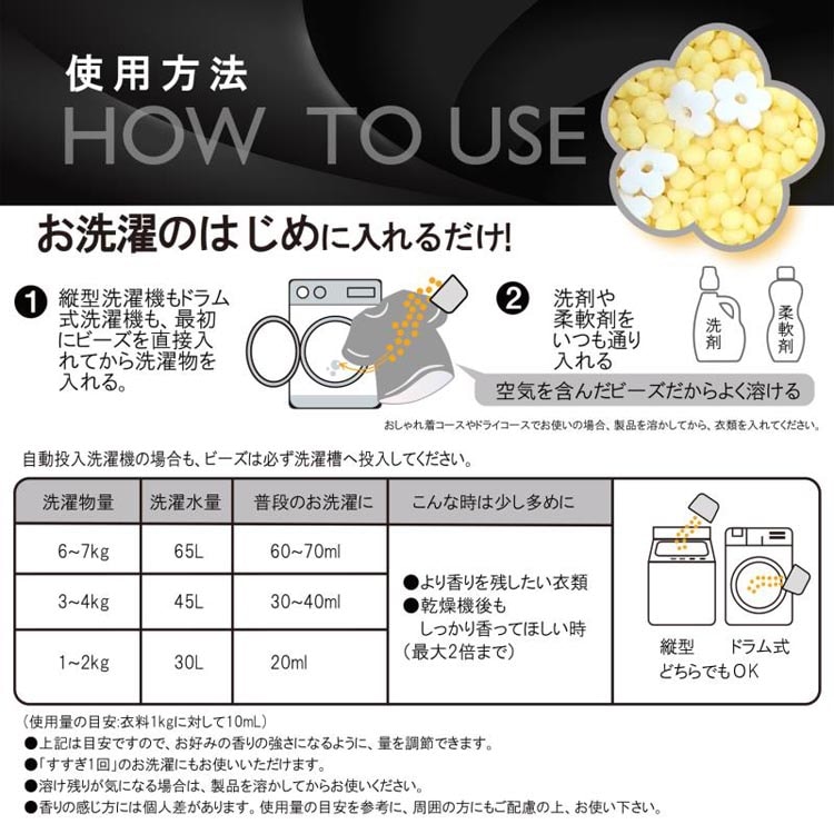 ●楽しさの演出:可愛いかたちの香りビーズが、いつものお洗濯にちょっとした楽しさをプラス。見た目にも気分が上がるデザイン。