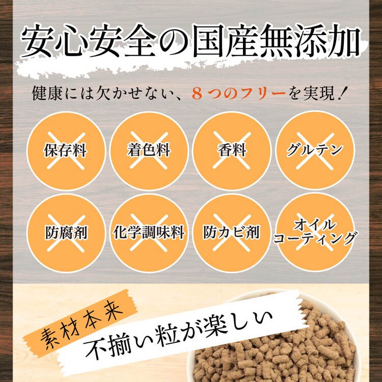 | 生肉(牛肉、馬肉、鶏肉、豚レバー、魚肉)、大麦全粒粉、魚粉、ヤシ粉末、玄米粉、大豆たんぱく粉末、たかきび、いも類(サツマイモ、ジャガイモ)、煎りゴマ、脱脂米ぬか、植物油(ひまわり油、菜種油)、ミネラル類(卵殻カルシウム、亜鉛、銅)、ビタミン類(A、E、B1、B2、パントテン酸、B6、B12、ナイアシン、葉酸、K、コリン)、乳清たんぱく、脱脂粉乳、海藻粉末、酵母エキス、タウリン、オリゴ糖、乳酸菌群 |