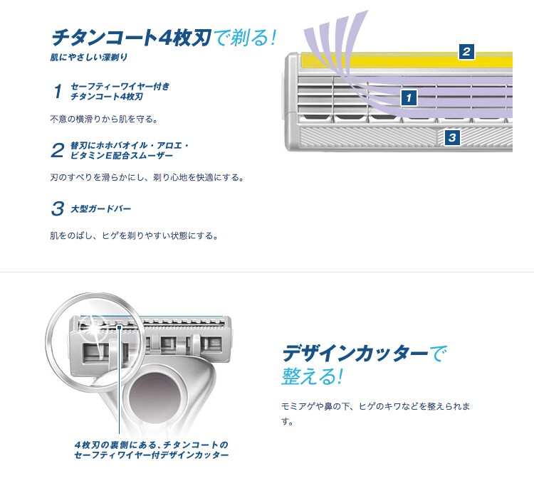 ●ホホバオイル・アロエ・ビタミンE配合のスムーザーが、刃のすべりを滑らかにし、剃り心地を快適に