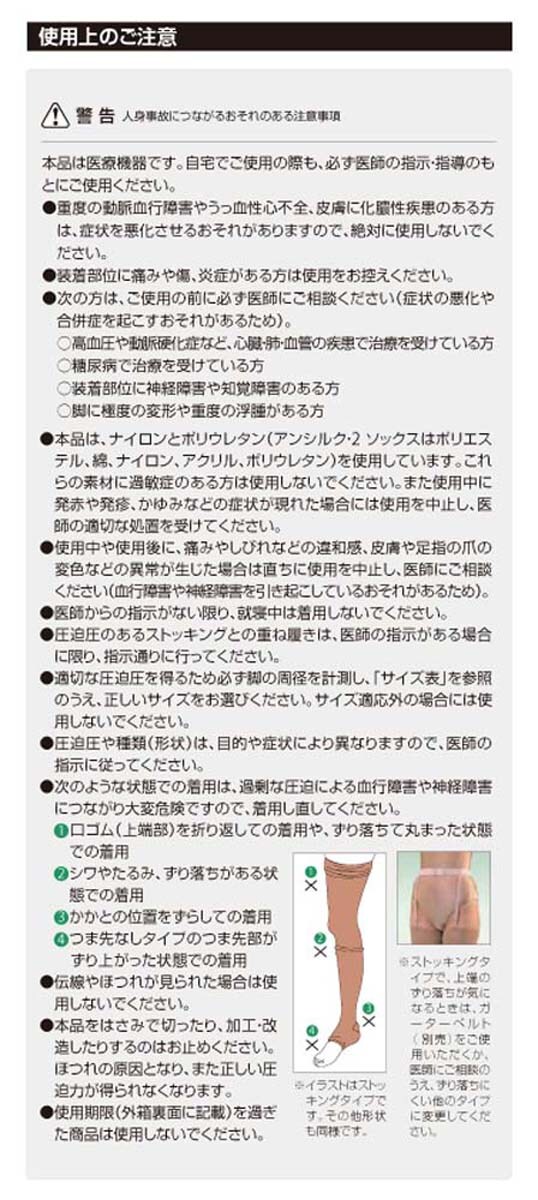 ・医師からの指示がない限り、就寝中は着用しないでください。・圧迫圧のあるストッキングとの重ね履きは、医師の指示がある場合に限り、指示通りに行ってください。