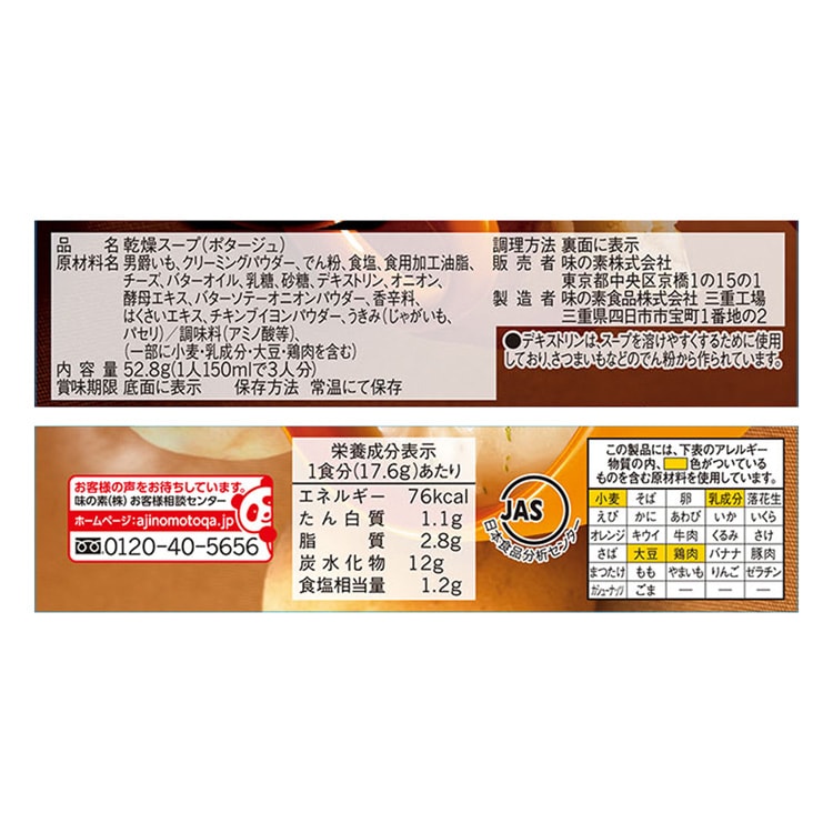 | 男爵いも、クリーミングパウダー、でん粉、食塩、食用加工油脂、チーズ、バターオイル、乳糖、砂糖、デキストリン、オニオン、酵母エキス、バターソテーオニオンパウダー、香辛料、はくさいエキス、チキンブイヨンパウダー、うきみ(じゃがいも、パセリ)/調味料(アミノ酸等)、(一部に小麦・乳成分・大豆・鶏肉を含む) |