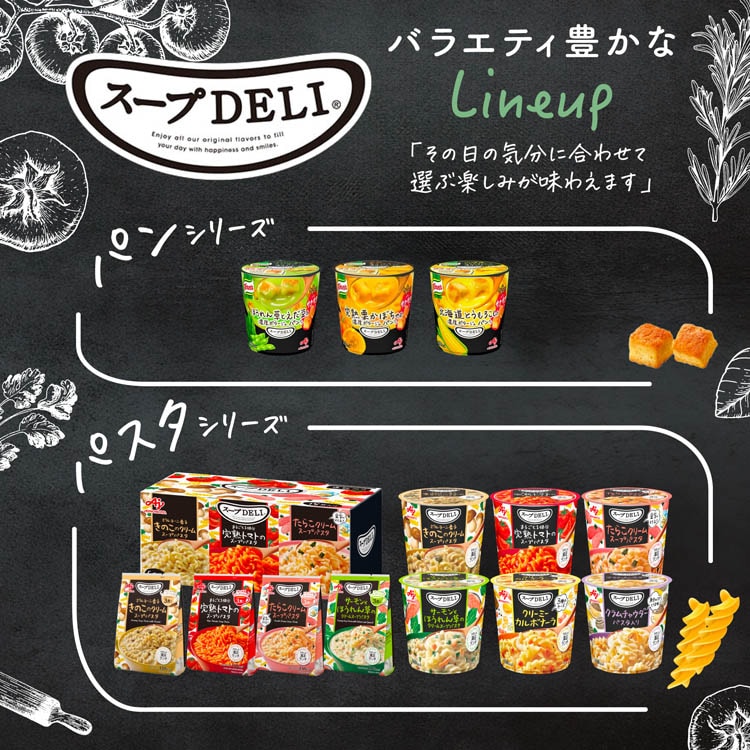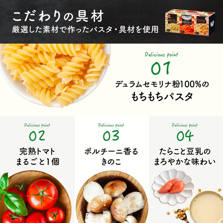 ●濃厚なスープがしっかり絡んで小腹を満たすことができる食べごたえのあるスープパスタが3種類入っています。