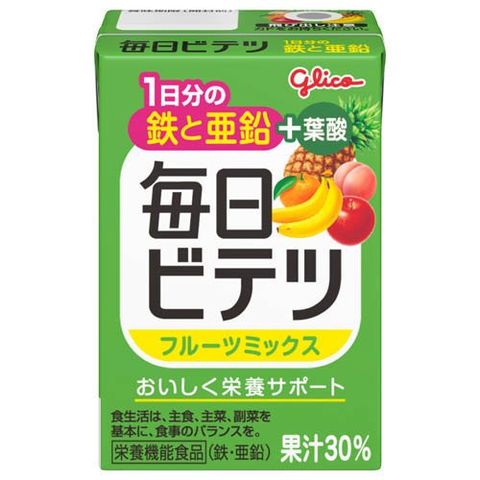 | 1本(100ml)当たり エネルギー:36kcal、たんぱく質:0g、脂質:0g、炭水化物:10.6g、-糖質:8.4g、-食物繊維:2.2g、食塩相当量:0g、鉄:7.5mg、亜鉛:10.0mg、カルシウム:200mg、ビタミンC:100mg、葉酸:240μg |