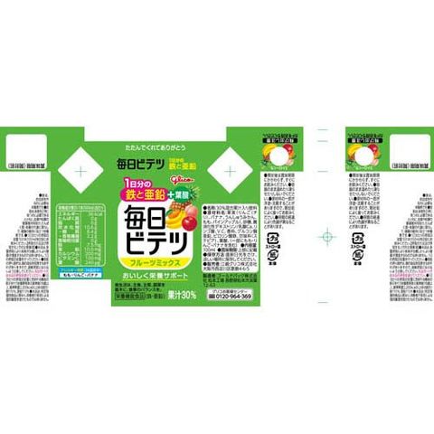 | 果実(りんご(チリ)、バナナ、うんしゅうみかん、もも、パインアップル)、砂糖、難消化性デキストリン/乳酸Ca、リンゴ酸、V.C、香料、グルコン酸亜鉛、ピロリン酸鉄、甘味料(ステビア)、葉酸、(一部にもも・りんご・バナナを含む) |