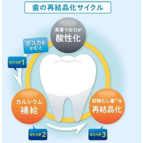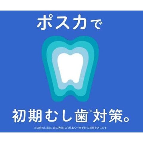 ●歯の主成分はカルシウムです。ポスカは水溶性カルシウム「POs-Ca」を配合しているので、カルシウムの浸透を促し、初期むし歯のはじまりである脱灰部位が、再石灰化と再結晶化をしやすい口内環境に整えます。