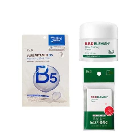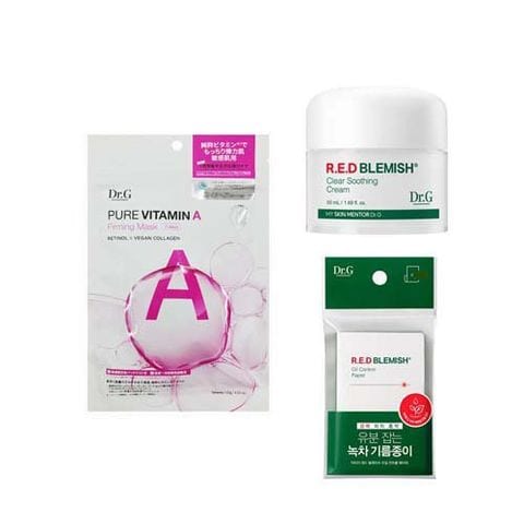 ●「Dr.G」のアイテム「R.E.D.BLEMISH クリアスージングクリーム」と、あぶらとり紙とピュアビタミンマスク(AまたはBいずれか1つ)がセットに!