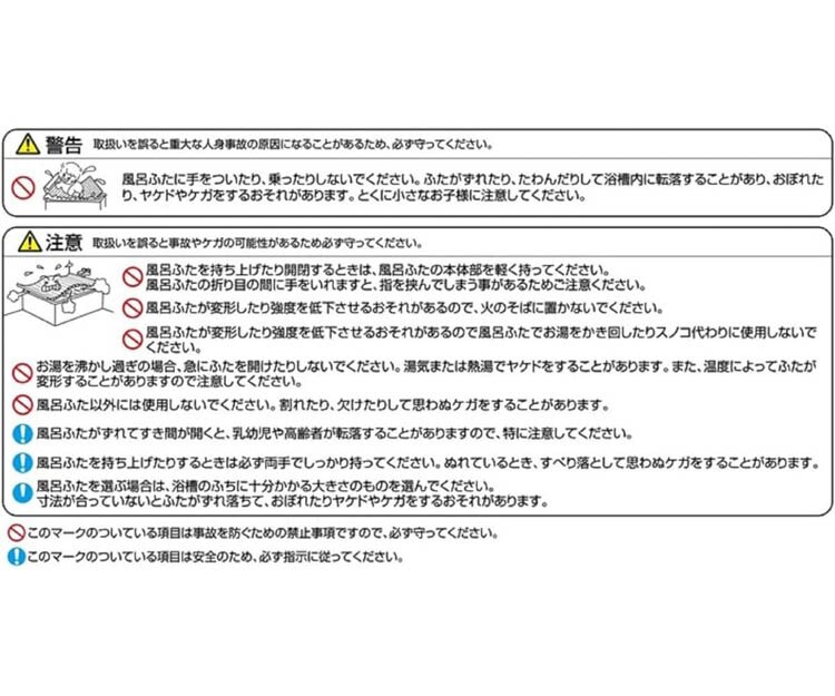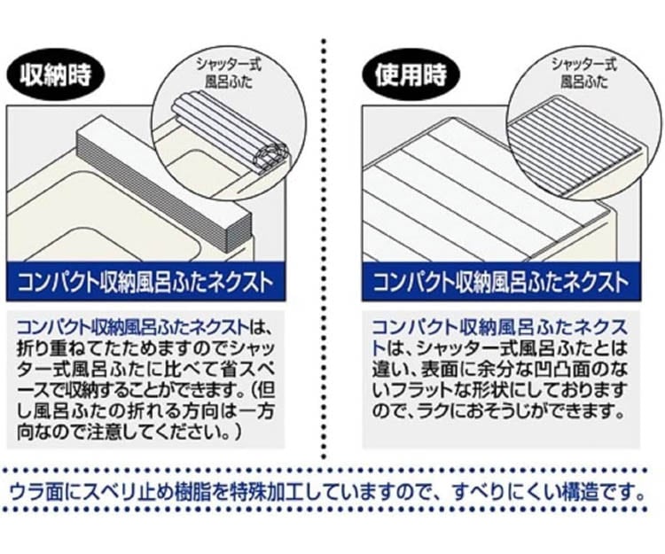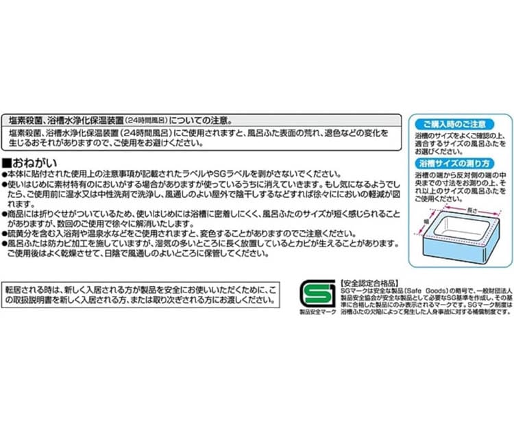 ・風呂ふたには折りぐせがついているため、使いはじめには浴槽に密着しにくく、サイズが短く感じられることがありますが、数回のご使用で徐々に解消いたします。