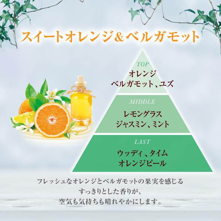 ●スイートオレンジ&ベルガモット フレッシュなオレンジとベルガモットの 果実を感じるすっきりとした香りが、 空気も気持ちも晴れやかにします。