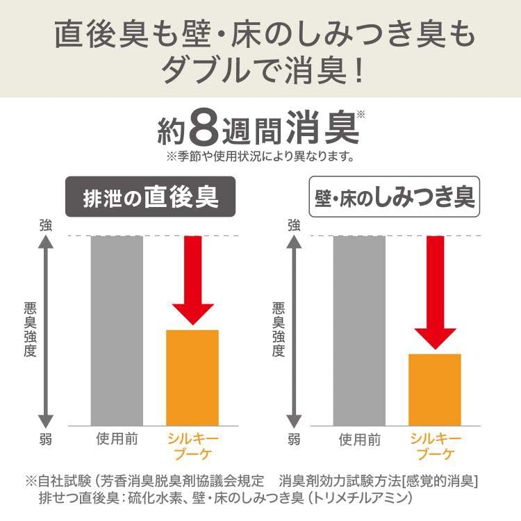 ●用を足した直後の気になる便のニオイを瞬間的に防ぐだけでなく、トイレに漂うニオイや、壁や床のしみつき臭まで継続的に消臭・防臭します。