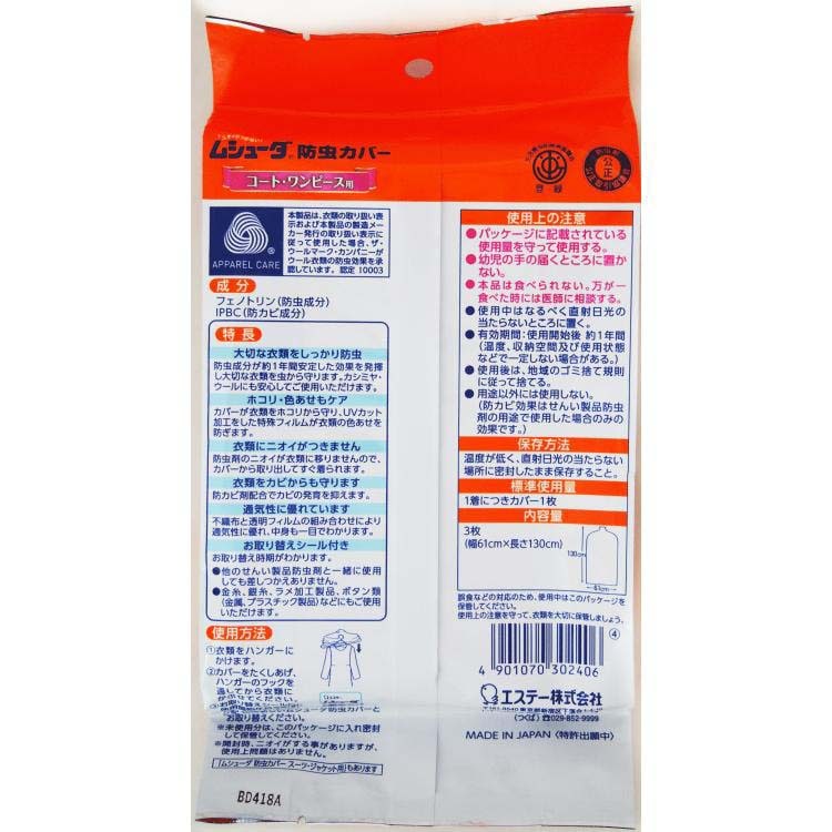 ●1年間の防虫効果で、大切な衣類を虫・ホコリから守ります。