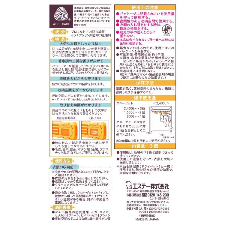 ●大切な衣類をしっかり防虫:防虫成分が約1年間安定した効果を発揮し大切な衣類を虫から守ります。 カシミヤ・ウールにもご使用いただけます。