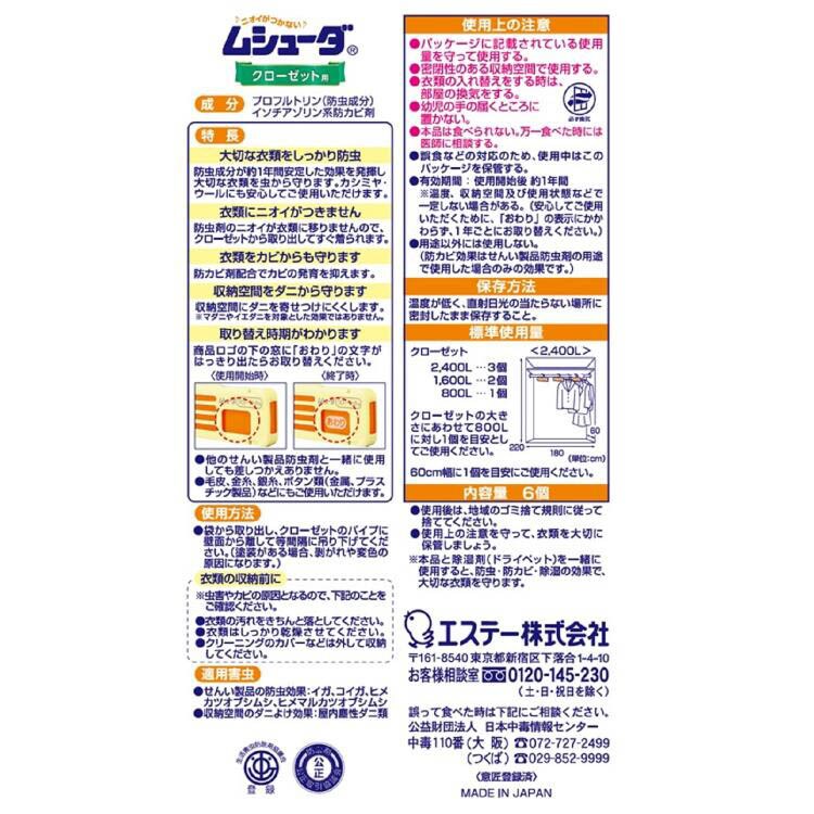 ムシューダ 衣類用 防虫剤 防カビ剤配合 クローゼット用 無香タイプ (6個入)