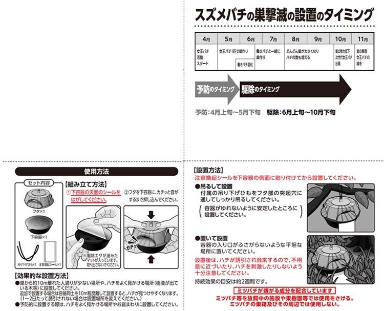・スズメバチがあまり飛んでいない時間帯(早朝や夕方以降)に設置してください。