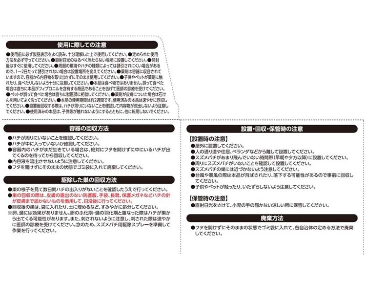 ・設置後回収する際は、ハチが周りにいないことを確認して内容物が流出しないよう注意してください。