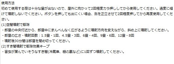 (適用害虫)ムカデ、ショウジョウバエ、チョウバエ、アリ、クモ、カメムシ、チャタテムシ、シバンムシ、カツオブシムシ、ユスリカ、ヤスデ、ゲジゲジ、ワラジムシ、ガ、キクイムシ、コナナガシンクイなど60種以上