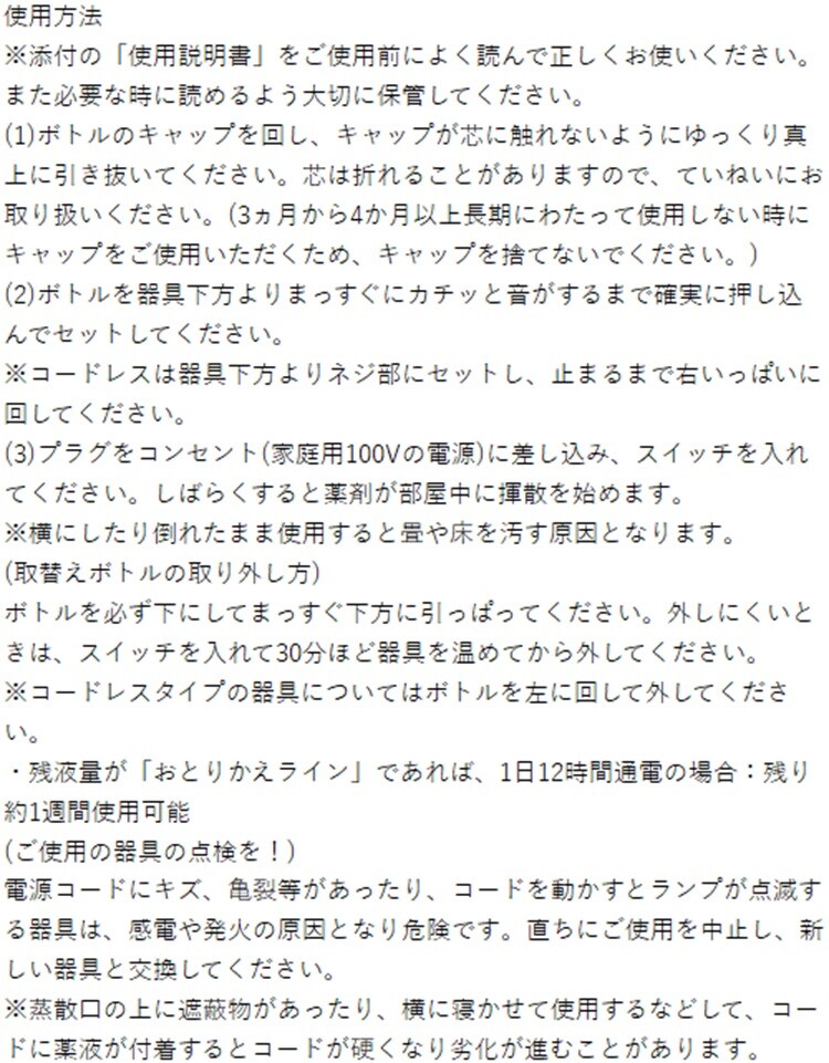 ・万一身体に異常が起きた場合や、液を誤って飲み込んだ場合は、直ちに本品がピレスロイド系薬剤を含む商品であることを医師に告げて診療を受けてください。