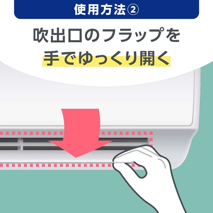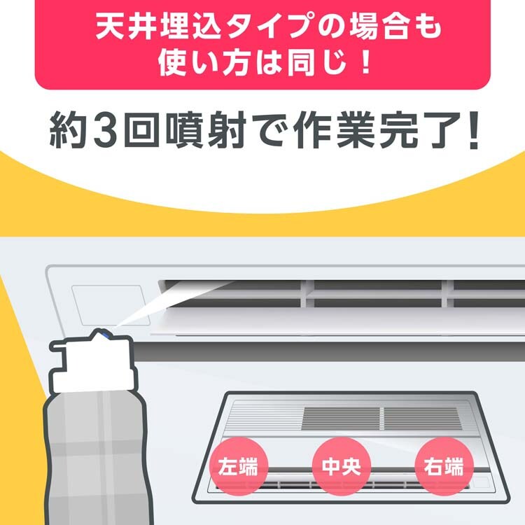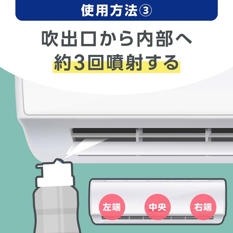 ●吹出口から内部へ向けて約3回(2回から4回)シュッとスプレーするだけ。ニオイが気になる時にいつでも使えるエアコン掃除スプレー!