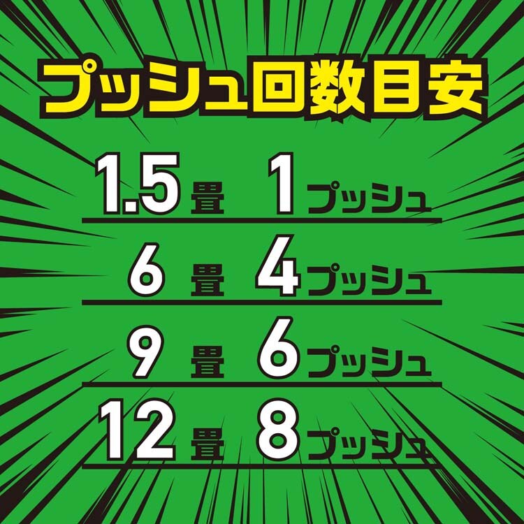 ・部屋中にまんべんなく広がるように噴射方向を変えながら、6畳(約25立方メートル)あたり4回の割合で、部屋の中央付近から斜め上に噴射してください。