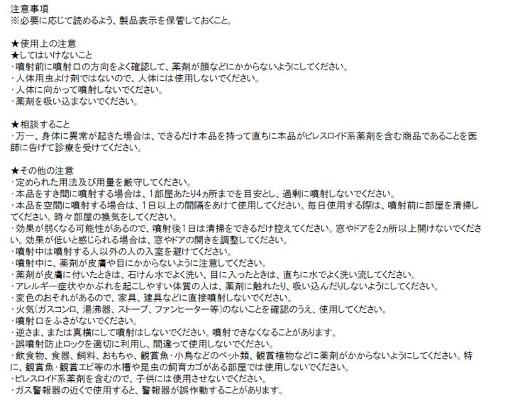 | 有効成分:ペルメトリン5.1g/本 その他の成分:1号灯油、LPG |