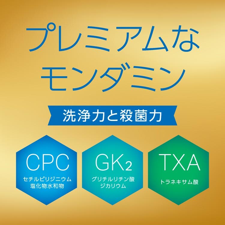 | 湿潤剤:濃グリセリン/溶剤:PG/可溶剤:POE硬化ヒマシ油/香味剤:香料(ホワイトミントタイプ)、キシリトール、スクラロース、サッカリンNa/洗浄剤:POEセチルエーテル、EDTA-2Na/薬用成分:セチルピリジニウム塩化物水和物、トラネキサム酸、グリチルリチン酸ジカリウム/pH調整剤:リン酸1Na、リン酸2Na/保存剤:パラベン |