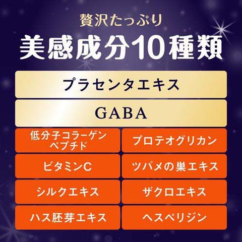 | 1箱150gあたり エネルギー:63kcal 、たんぱく質:6.9g 、脂質:0g、炭水化物:12g、食塩相当量:0.3g 、ビタミンC:225mg プラセンタエキス換算:64000mg(粉末1600mg)、GABA:1500mg、コラーゲン:3200mg、プロテオグリカン:6000μg、ツバメの巣エキス:108mg、シルクエキス:108mg、ザクロエキス:22mg、ハス胚芽エキス:22mg、ヘスペリジン:54mg、カフェイン:0mg |