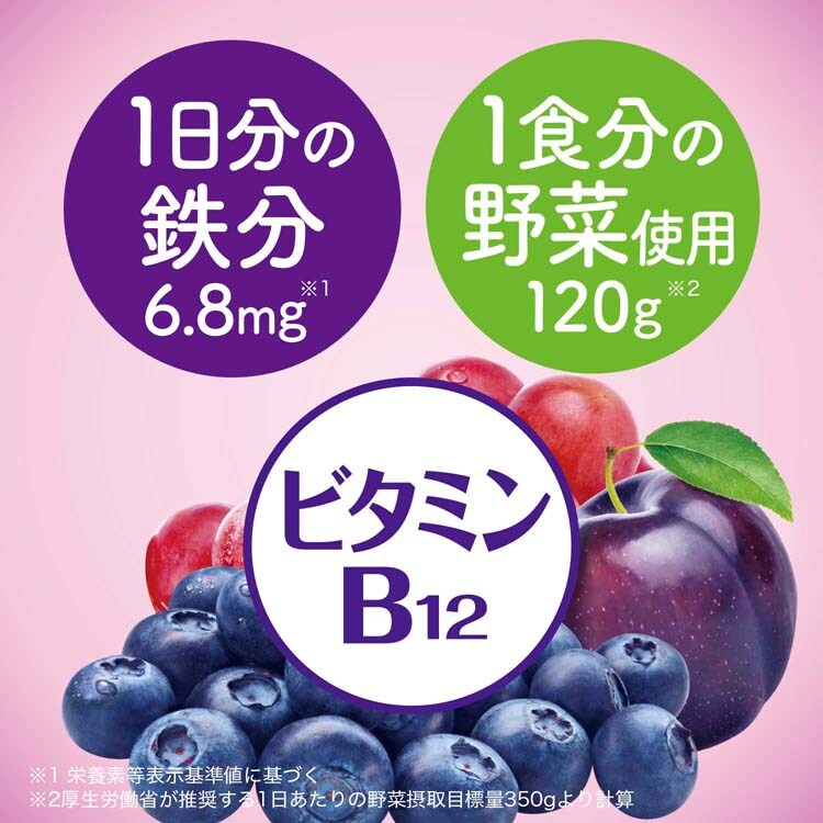 1日当たりの栄養素等表示基準値(18歳以上、基準熱量2、200kcal)に占める割合:鉄 100%、ビタミンB12 37~117%、葉酸 31-80%(200ml当たり)