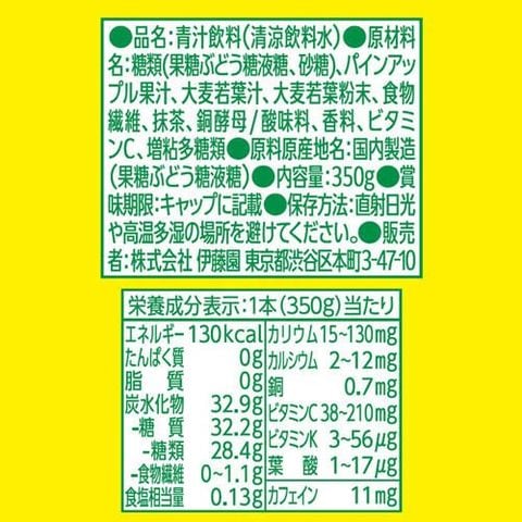 | 糖類(果糖ぶどう糖液糖(国内製造)、砂糖)、パインアップル果汁、大麦若葉汁、大麦若葉粉末、食物繊維、抹茶、銅酵母/酸味料、香料、ビタミンC、増粘多糖類 |