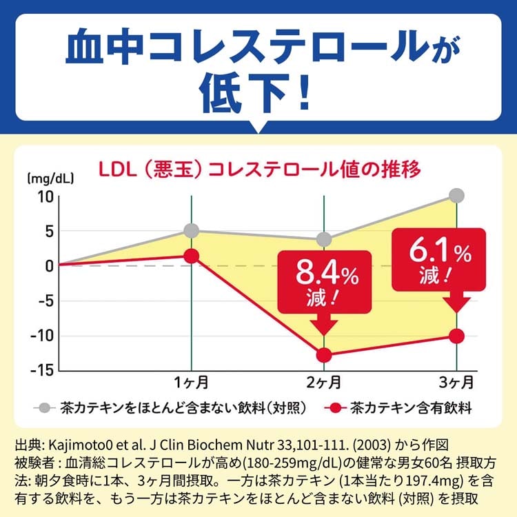 許可表示:本品は茶カテキンを含みますので、食事の脂肪の吸収を抑えて排出を増加させ、体に脂肪がつきにくいのが特長です。また、本品はコレステロールの吸収をおだやかにする茶カテキンの働きにより、血清コレステロール、特にLDL(悪玉)コレステロールを減らすのが特長です。体脂肪が多めの方やコレステロールが高めの方に適しています。