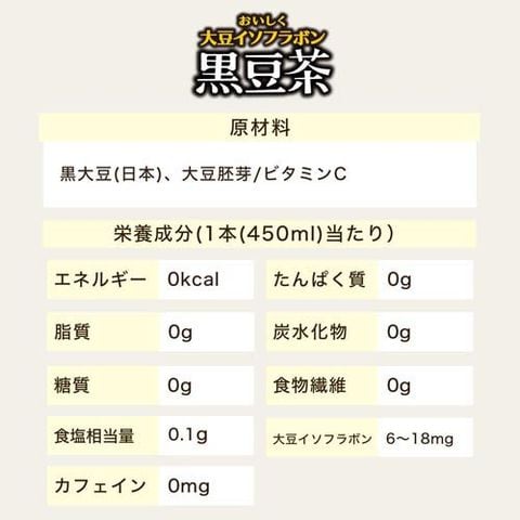 | 1本(450ml)当たり エネルギー:0kcal、たんぱく質:0g、脂質:0g、炭水化物:0g(糖質:0g、食物繊維:0g)、食塩相当量:0.1g、大豆イソフラボン:6~18mg、カフェイン:0mg |
