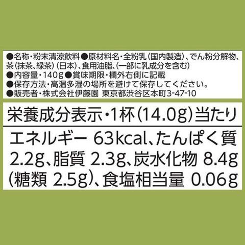 全粉乳(国内製造)、でん粉分解物、茶(抹茶、緑茶)(日本)、食用油脂、(一部に乳成分を含む)