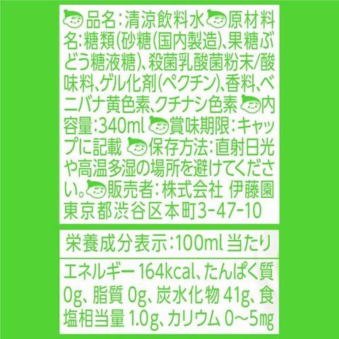 | 糖類(砂糖(国内製造)、果糖ぶどう糖液糖)、殺菌乳酸菌粉末/酸味料、ゲル化剤(ペクチン)、香料、ベニバナ黄色素、クチナシ色素 |