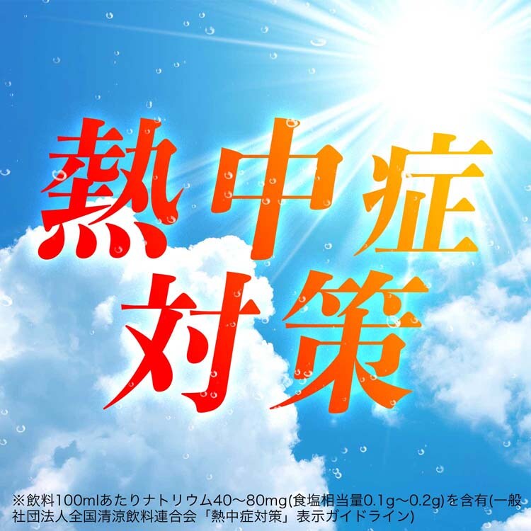 ●本品は、熱中症対策飲料の基準を満たしています。熱中症対策飲料は、飲料100ml当たりナトリウムを40~80mg含むことを基準としています。