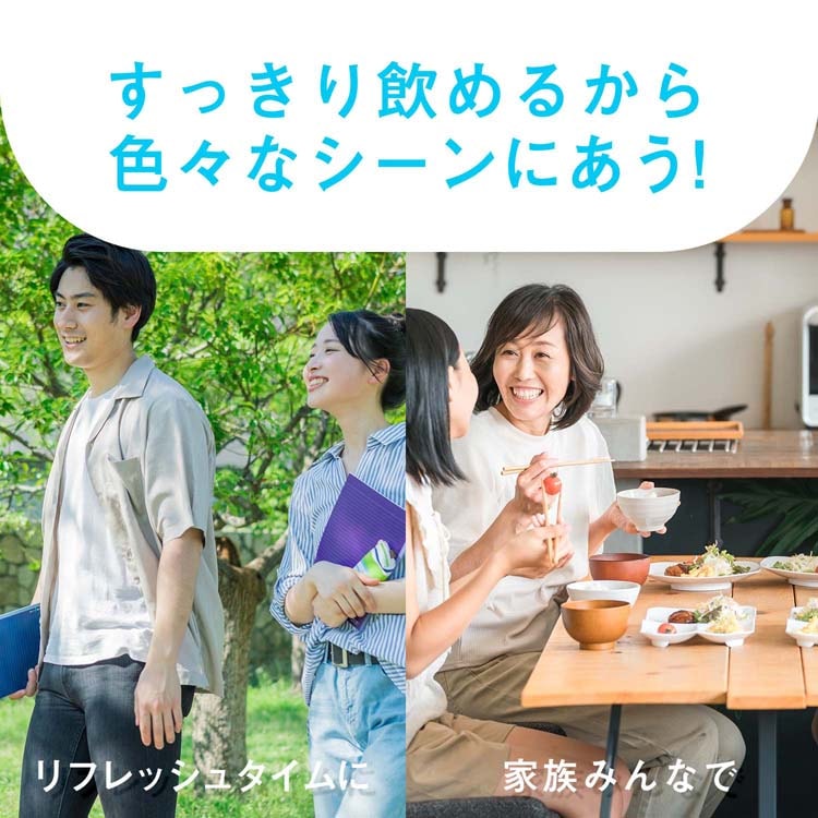 ●食事中にも、すっきりとおいしくお愉しみいただけます。また、カフェインゼロなので、家族みんなに嬉しい飲み物です。